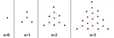 - الصور التالية توضح كيفية بناء العدد الممركز المثلثي على مراحل، تضاف إلى النقاط الحمراء النقاط الزرقاء الجديدة في كل مرحلة.