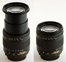 عدسة نيكور المقربة 28-200 مم، مددت إلى 200 ملم في الصورة اليسرى وقلصت إلى 28 مم في الصورة اليمنى.