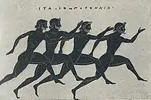 - كان هذا السباق أقصر قليلاً (لكنه يسير على خط مستقيم)، ويُسمى <a href="https://en.wikipedia.org/wiki/Stadion_(ancient_sports)" rel="mw:ExtLink" data-linkid="98" class="mw-redirect cx-link" title="Stadion (ancient sports)">stadion</a> هو أول حدث مسجل في الألعاب الأولمبية القديمة وهو أقدم حدث رياضي رسمي معروف في التاريخ.