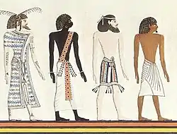 النصوص الجنائزية المصرية القديمة (في المملكة الحديثة) المعروفة بكتاب البوابات تفرق بين "أربع جماعات" تسير في موكب. وهم المصريون، والشوام والكنعانيون أو "الآسيويون"، والنوبيون، و الليبيون بيض البشرة.[5] ويظهر المصريون ببشرة تبدو داكنة مقارنة بالشاميين والليبيين، وفاتحة مقارنة بالنوبيين.