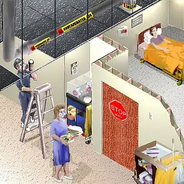 وهذا يتضمّن مظاهر للرعاية تقتضي استخدام معدّات مشتركة بين جميع المرضى في المبنى، أو تقتضي نقل المريض لمنطقة يتشارك بها جميع المرضى.