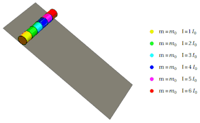 تبدأ لحظة القصور الذاتي للبندول المركب من قرص رفيع مركب في نهاية قضيب رفيع يتأرجح حول محور في الطرف الآخر من القضيب، ويبدأ بحساب لحظة القصور الذاتي للقضيب الرفيع والقرص الرفيع حول مراكز الكتلة الخاصة بهم.[22]