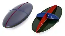 إن لحظة مصفوفة القصور الذاتي في إحداثيات إطار الجسم هي شكل تربيعي يحدد سطحًا في الجسم يسمى الشكل الإهليلجي لـ بوينسوت.[30] دع تكون مصفوفة القصور الذاتي بالنسبة إلى مركز الكتلة المحاذاة مع المحاور الرئيسية، ثم السطح