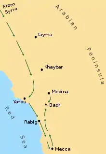 قاد النبي محمد الصحابة في سلسلة من الغارات على القوافل التجاريوة الخاصة بقريش. كانت هذه الغارات هجومية بشكل عام[5] ونُفذت لجمع المعلومات الاستخبارية أو الاستيلاء على البضائع التجارية من القوافل الممولة من قريش، وهذا الانتقام قد كان نظير ما استولت عليه قريش من أموال المسلمين عند هجرتهم بدينهم إلى المدينة المنورة.[6][7] أعلن المسلمون أن الغارات لها ما يبررها وأن الله منحهم الإذن للدفاع ضد اضطهاد قريش للمسلمين .[8][9] يبدو أن هناك سببًا آخر للغارات هو الضغط الاقتصادي، حيث أن إنتاج الغذاء في المدينة المنورة بالكاد كان قادرًا على إطعام القادمين الجدد المسلمين. وبالتالي، كان مداهمة الغذاء إلزامية لتكملة نظامهم الغذائي.[10]