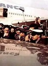 سيد روح الله الخميني في المطار بعد نزوله من الطائرة.