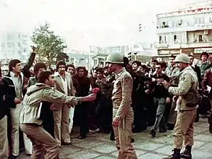 الناس يعطون الزهور لجنود نظام الشاه ليعتبروا الجنود أبناء الشعب والثورة وليس أبناء النظام الملكي.