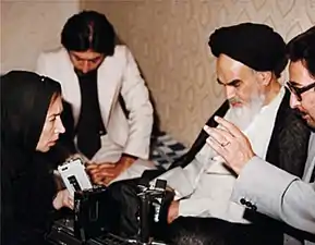 أبو الحسن بني صدر والصحفية الإيطالية أوريانا فالاسي إلي جانب سيد روح الله الخميني.