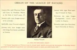 خرج المجتمعون من مؤتمر باريس للسلام وقد اتفقوا على الحفاظ على السلام الدائم بعد الحرب العالمية الأولى، ووافقوا على تأليف عصبة الأمم التي دعا إليها الرئيس ويلسون في 25 يناير سنة 1919.[23] صيغ ميثاق العصبة من قبل جمعيّة مختصة، وتأسست العصبة بشكل رسمي بعد أن نصّ عليها في الفقرة الأولى من معاهدة فيرساي. وفي 28 يونيو سنة 1919،[24][25] قامت 44 دولة بالتوقيع على ميثاق العصبة، منها 31 دولة شاركت بالحرب إلى جانب كتلة الوفاق الثلاثي، وعلى الرغم من جهود ويلسون الحثيثة لإنشاء العصبة، والتي مُنح بسببها جائزة نوبل للسلام في شهر أكتوبر من عام 1919،[26] فإن الولايات المتحدة، بقيادة الكونغرس والجمهوري، رفضت التصديق على ميثاق العصبة أو الانضمام لها. فقد رأت الولايات المتحدة في النظام التأسيسي للعصبة محاولة من الدول الأوروبية الاستعمارية الكبرى للاستئثار بغنائم الحرب العالمية الأولى.