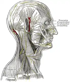 ![]() الاعصاب الحسية في الرأس وتفرعات العصب الخامس (يظهر العصب تحت الحجاج أوسط اليسار، عند الأنف). الاعصاب الحسية في الرأس وتفرعات العصب الخامس (يظهر العصب تحت الحجاج أوسط اليسار، عند الأنف). | |