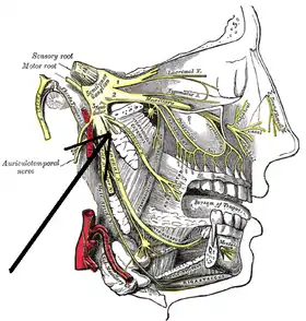 ![]() تفرع إلى عصب فك علوي وعصب فك سفلي ، و العقدة الفكية (العقدة التحت فك علوي) | |