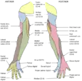 الجانب الأمامي من الطرف العلوي الأيمن, مظهراً العلامات السطحية للعظام, والشرايين, والأعصاب.