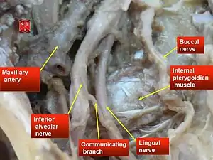 ![]() Mandibular division of the trigeminal nerve. (Inferior alveolar labeled at bottom right.) Mandibular division of the trigeminal nerve. (Inferior alveolar labeled at bottom right.) | |
