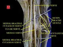 ![]() أعصاب الطرف العلوي. العصب العضلي الجلدي (Musculocutaneous) موسوم في أعلى يمبن الصورة | |