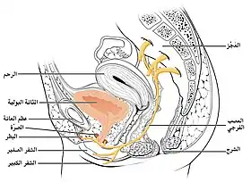 ![]() مقطعٌ عرضي في حوض الأنثى، حيثُ ينشأ العصب الفرجي من العصب العجزي الثاني والثالث والرابع، ثم يتمد بين الرحم والشرج، وإلى الشفران الصغيران والكبيران والبظر. مقطعٌ عرضي في حوض الأنثى، حيثُ ينشأ العصب الفرجي من العصب العجزي الثاني والثالث والرابع، ثم يتمد بين الرحم والشرج، وإلى الشفران الصغيران والكبيران والبظر. | |
