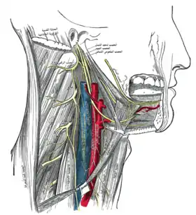 ![]() صورة توضح توزيع الأعصاب في الفك السفلي، والعقدة تحت الفك العلوي. | |