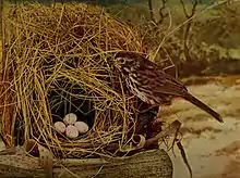 تتولَّى الأنثى مُهمَّة بناء العش، وتعمل غالبًا خلال وضح النهار وبالأخص عند الفترة الصباحيَّة. والعُش عبارة عن كأسٍ بسيطة متينة البنيان مصنوعة من الأعشاب، والحشائش الضارَّة، ويُغلَّف من الخارج ببعض اللحاء، ويُبطَّن في الداخل بواسطة الأعشاب والجُذيرات، وشعر الحيوانات. يتطلب إنشاء العش حوالي 4 أيَّام، ويتراوح عرضه بين 4 و8 إنشات، وعمقه بين 2.5 و4 إنشات، عند الانتهاء. تضعُ الأنثى حضنةً يتراوح عدد البيوض فيها بين 3 و5 بيضات بُنيَّة اللون مُبرقشة برُقطٍ بيضاء مُخضرَّة.