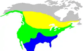 ![]() الأصفر: زائر صيفي، الأزرق: مُشتٍ، الأخضر: مقيم مُفرخ | |