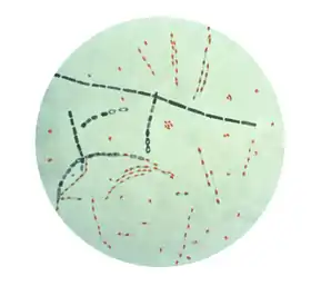 ![]() صورة مجهرية لل"عصوية الجمرية (صبغة الفوشين-ميثيلين الأزرق للأبواغ) | |