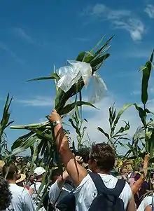 اقتلاع نباتات الذرة المعدلة وراثيا في بلدية مونفيل (بإقليم غارون العليا بفرنسا) في الخامس والعشرين من شهر يوليو عام 2004.