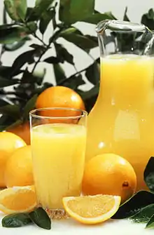 عصير البرتقال وهو ما ينتج من عصير عند عصر البرتقال. يعد عصير البرتقال مصدراً ممتازاً للفيتامين سي (حمض الأسكوربيك) . كما أنه غني بالبوتاسيوم وحمض الفوليك الذي ينصح به للحوامل .[1]