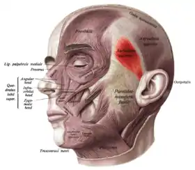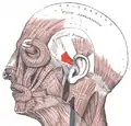 ![]() عضلات الوجه والعنق (وتظهر العضلة الأذنية الأمامية باللون الأحمر). | |
