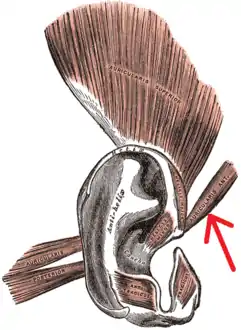 ![]() عضلات الأذن (وتظهر العضلة الأذنية الأمامية مُشاراً إليها). عضلات الأذن (وتظهر العضلة الأذنية الأمامية مُشاراً إليها). | |