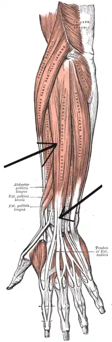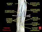 ![]() السطح الخلفي للساعد. عضلات سطحية. يتم تمييز العضلة الباسطة الأصابع باللون الأرجواني. | |