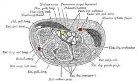 ![]() مقطع عرضي عبر المعصم والأرقام. (تحويلة حفر البلدية المسمى في أسفل المركز.) مقطع عرضي عبر المعصم والأرقام. (تحويلة حفر البلدية المسمى في أسفل المركز.) | |