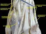 مقابل المفصل السنعي السلامي، يرتبط كل وتر عن طريق الحزم بالأربطة الجانبية ويعمل بمثابة الرباط الظهري لهذا المفصل ؛ بعد عبور المفصل، ينتشر في صفاق عريض يغطي السطح الظهري للكتائب الأولى ويتم تقويته، في هذه الحالة، بأوتار إنتروسي والعضلات الخراطينية لليد .[6]