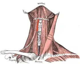 ![]() عضلات الرقبة. منظر جانبي وتظهر العضلة الدرقية اللامية في الوسط على اليسار | |