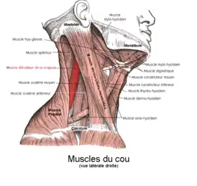 ![]() عضلات العنق. (العضلة رافعة الكتف تظهر في يسار الوسط). عضلات العنق. (العضلة رافعة الكتف تظهر في يسار الوسط). | |