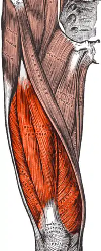 - العضلة المستقيمة الفخذية (بالإنجليزية: Rectus femoris muscle): تحتل منتصف الفخذ وتغطي أغلب عضلات الفخذ الثلاث الأخرى. تنشأ تلك العضلة من عظم الحَرْقَفة (الورك) (بالإنجليزية: Ilium)، واكتسبت اسمها هذا من مسارها المستقيم.