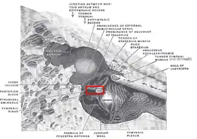 ![]() الجدار الأوسط و جزء من الجدران الخلفية و الأمامية للجوف الطبلي الأيمن، منظر وحشي. | |