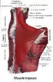 | الأعصاب | العصب القحفي الحادي عشر (خصوصا) والفروع البطنية (الأمامية) للألياف الرقبية الثانية والثالثة والرابعة |