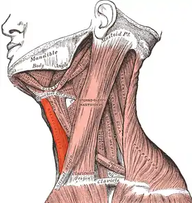 ![]() عضلات الرقبة. العضلة القصية اللامية موسومة في الوسط، مباشرة إلى اليمين من غضروف الغدة الدرقية. | |