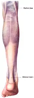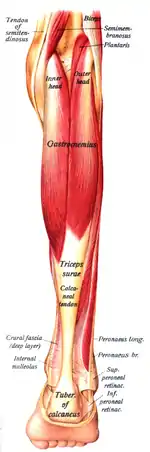 ![]() منظر خلفي لعقبي الكعب البشري مع عضلة مثلثة الرؤوس الساقية. (اثنين منها مرئية في البداية) | |