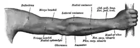 ![]() Back of right upper extremity. (Anconeus labeled at bottom center.) | |