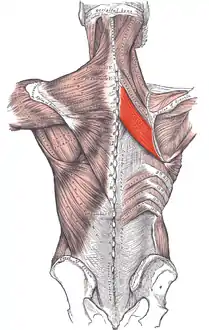 ![]() العضلات الواصلة بين الطرف العلوي بالعمود الفقري.(العضلة المعينية الكبيرة اليمنى تظهر في الأعلى على اليمين باللون الأحمر الفاقع). | |