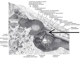 ![]() الجدار الوسطي وجزء من الجدارين الخلفي والأمامي للتجويف الطبلي الأيمن، نظرة جانبية. (يشار لل"عضلة الموترة للطبلة" نحو اليمين من الصورة، الاسم الثاني من الأسفل.) الجدار الوسطي وجزء من الجدارين الخلفي والأمامي للتجويف الطبلي الأيمن، نظرة جانبية. (يشار لل"عضلة الموترة للطبلة" نحو اليمين من الصورة، الاسم الثاني من الأسفل.) | |