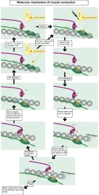 3- دورة التقلص-الارتخاء: يمكن تفسيرها على المستوى المجهري بأنها نظرية الخيوط المنزلقة، وعلى المستوى الجاهري تُسمى "اختلاجة". ولنشرح قليلاً عن نظرية الخيوط المنزلقة قبل الخوض في تفاصيل الانقباض.