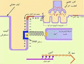 2- تَقارُنُ الاسْتِثارَةِ والتَّقَلُّص: ويعني الوصل بين الإثارة التي يسببها جهد الفعل الذي سرى على غمد الليف العضلي وبين انقباض الليف العضلي، وذلك يحدث بأن يتسبب جهد الفعل (الذي سار على الغمد حتى وصل أنيبيبات T) في إفراز أيونات الكالسيوم من مصدرها والتي ستتسبب في فتح مواقع ارتباط الميوسين بالأكتين على خيوط الأكتين ومن ثم انقباض الليف العضلي.