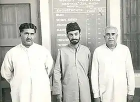![]() مير جول خان نصير (على اليسار) وعطا الله منغال (في الوسط) ومير غاوس بخش بيزنجو (على اليمين) في صورة جماعية تاريخية تم التقاطها في سجن ماخ. | |