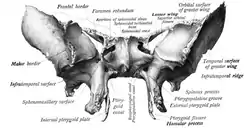 ![]() العظم الوتدي، أحد أكثر العظام تعقيدا في الجسم البشري وهو يصنف كعظم غير منتظم. | |
