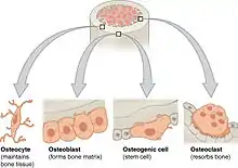 العظم هو نسيج نشط أيضيًا يتكون من أنواع متعددة من الخلايا. تشمل تلك الخلايا بانيات العظم، التي تشارك في صنع وتمعدن نسيج العظم، والخلايا العظمية، وناقضات العظم، التي تشارك فيتشرب العظم. تُشتق الخلايا العظمية وبانيات العظم من خلايا السليفة العظمية، فيما تُشتق ناقضات العظم من نفس الخلايا التي تتمايز لتكوين بلاعم وخلايا وحيدة.[6] يوجد كذلك خلال نخاع العظام الخلايا الجذعية المكونة للدم. تنشئ تلك الخلايا خلايا أخرى تشمل خلايا الدم البيضاء، وكريات الدم الحمراء، والصفائح الدموية.[6]
