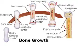 - منطقة تضخم الخلايا. بعد ذلك، تتوقف الخلايا الغضروفية عن الانقسام وتبدأ في التضخم، كما تفعل في مركز التعظم الأولي في الجنين.[17]