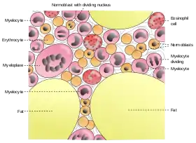يحتوي الجزء الإسفنجي من العظم على نخاع العظام. ينتج نخاع العظام خلايا الدم في عملية تسمى تكون الدم.[21] خلايا الدم التي تصنع في نخاع العظام تشمل كريات الدم الحمراء، والصفائح الدموية، وخلايا الدم البيضاء. الخلايا المولدة مثل الخلية الجذعية المكونة للدم تنقسم في عملية تسمى الانقسام المتساوي (الميتوزي) لإنتاج الخلايا السلائف. وتتضمن الخلايا السلائف التي تنشئ في النهاية خلايا الدم البيضاء وكريات الدم الحمراء. على عكس خلايا الدم الحمراء والبيضاء، المصنوعة بالانقسام الميتوزي، تنسل الصفائح الدموية من خلايا كبيرة جدا تسمى خلية نواء. عملية التمايز التدريجي تلك تحدث في نخاع العظام. بعدما تنضج الخلايا، فإنها تدخل جهاز الدوران. يوميًا، يتم إنتاج ما يزيد عن 2.5 مليار كرية دم حمراء، وصفيخة دموية و50-100 مليار خلية محببة.[6]
