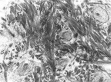 صورة مجهرية بالمجهر الإلكتروني للعظم بتكبير 100 مرة- Steele, D. Gentry; Claud A. Bramblett (1988). The Anatomy and Biology of the Human Skeleton. Texas A&M University Press. صفحة 4. ISBN 0-89096-300-2. مؤرشف من الأصل في 2 يناير 2020. الوسيط