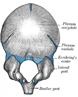يقال إن المستوى القذالي يتعظم إنطلاقا من مركزين والجزء القاعدي يتعظم إنطلاقا من مركز واحد.