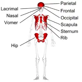 ![]() العظم المسطح في الهيكل العظمي البشري - موضح باللون الأحمر. العظم المسطح في الهيكل العظمي البشري - موضح باللون الأحمر. | |