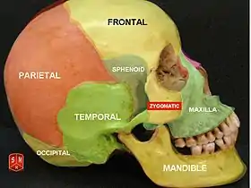 ![]() عظام القحف (يمكن رؤية نهاية جناح العظم الوتدي فقط في هذه الصورة). | |